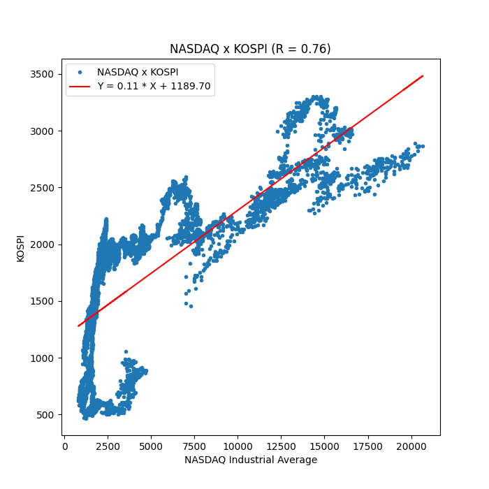 나스닥(NASDAQ)과 코스피(KOSPI) 지수 간 상관 관계 분석: Python을 활용한 데이터 분석 및 시각화